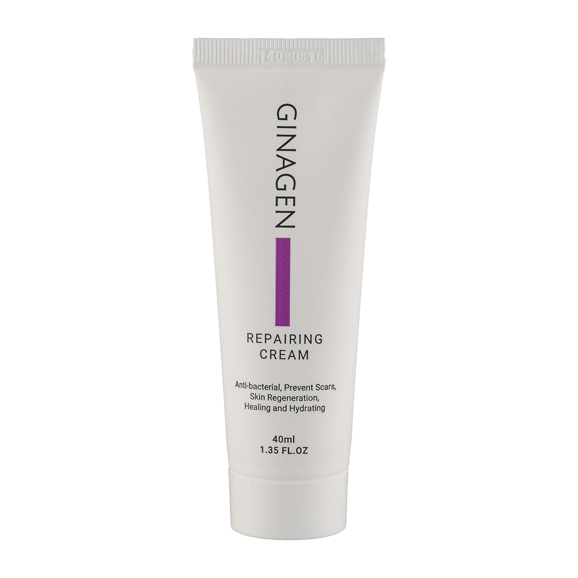 کرم ترمیم کننده ژیناژن، با خاصیت‌های ضد‌التهابی و ضد‌میکروبی، جلوگیری از به جای ماندن زخم و ترمیم بافت آسیب دیده، مناسب برای انواع پوست، با ویتامین E و عصاره پیاز.